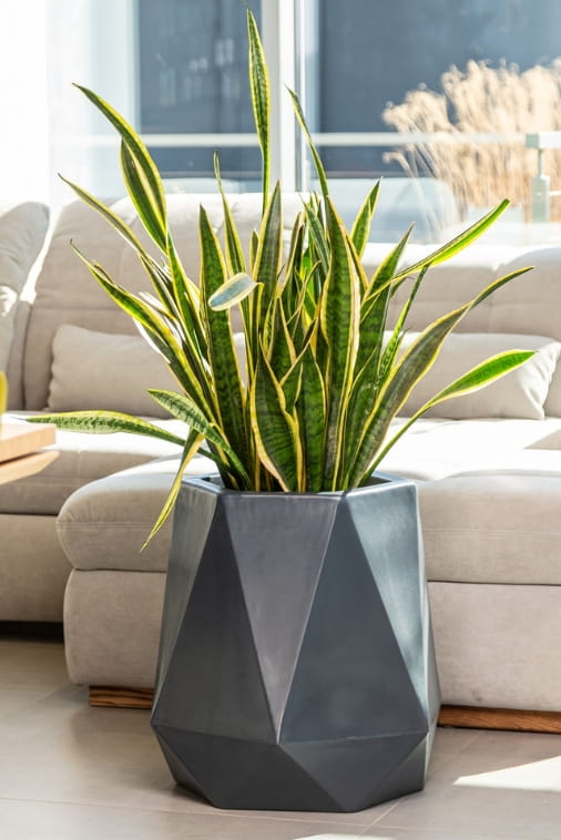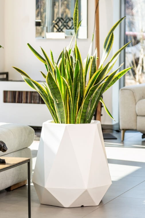 Duże geometryczne donice Flavi są stworzone do eksponowania wysokich kwiatów takich jak Sansevieria gwinejska, juka, fikus czy zamiokulkas.
