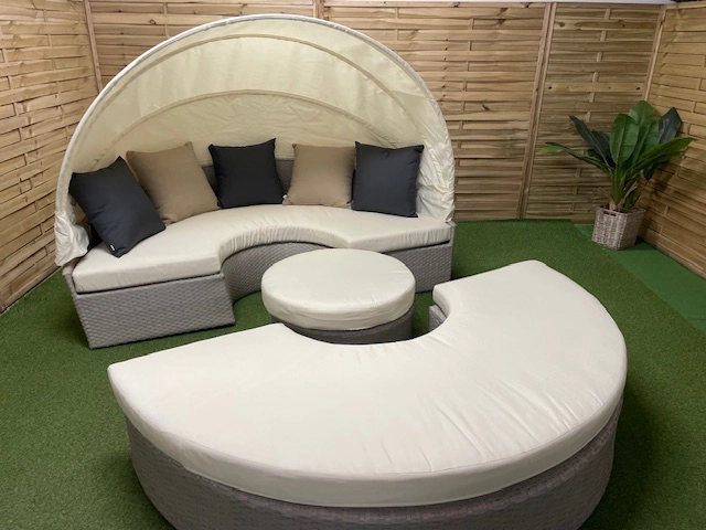 Meble ogrodowe wypoczynkowe Big Moon – wyspa ogrodowa z baldachimem, element z baldachimem, kanapy, stolik, puf, 9 miejsc