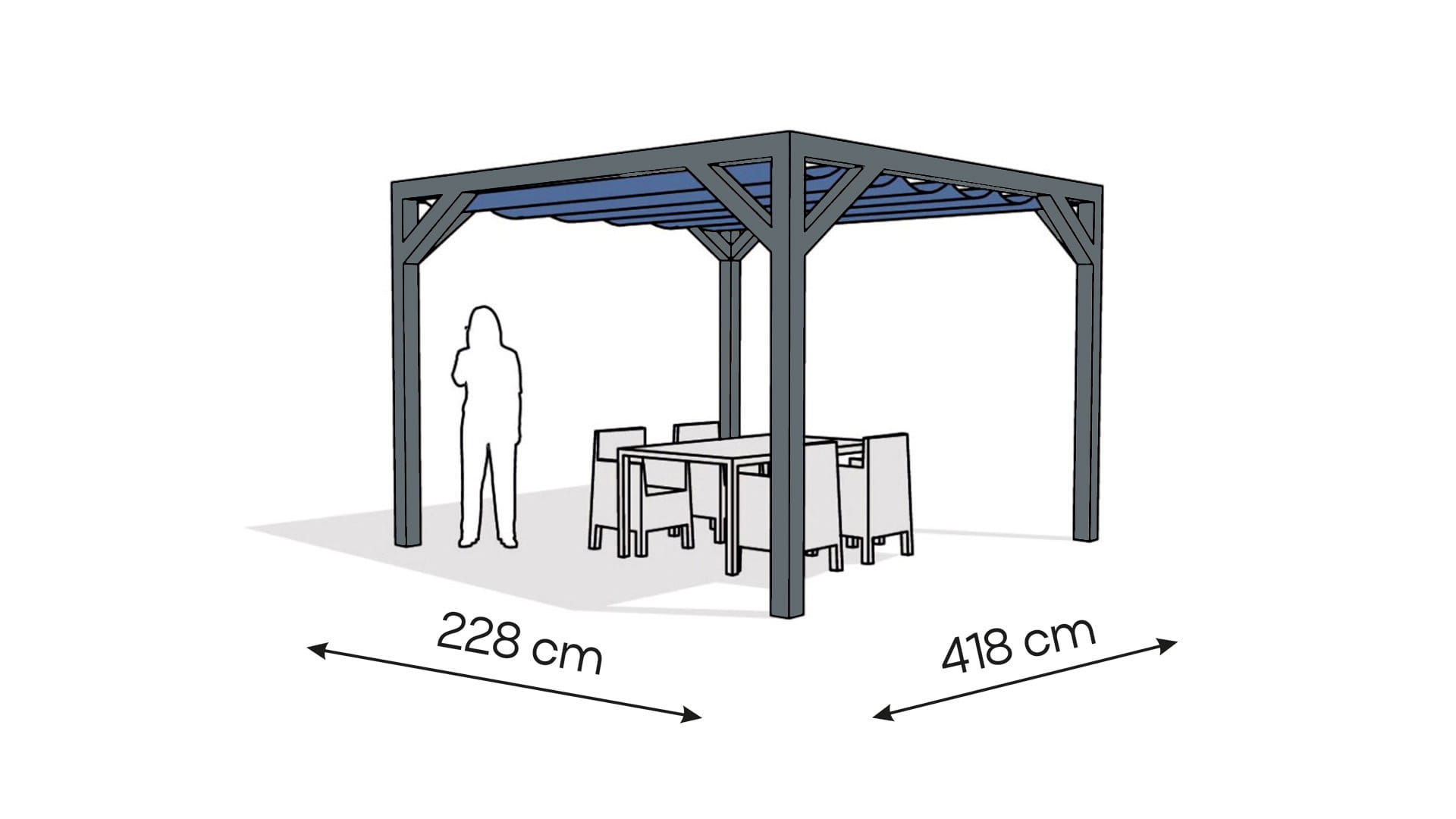 wymiary zewnętrzne pergoli: 228 x 418 cm