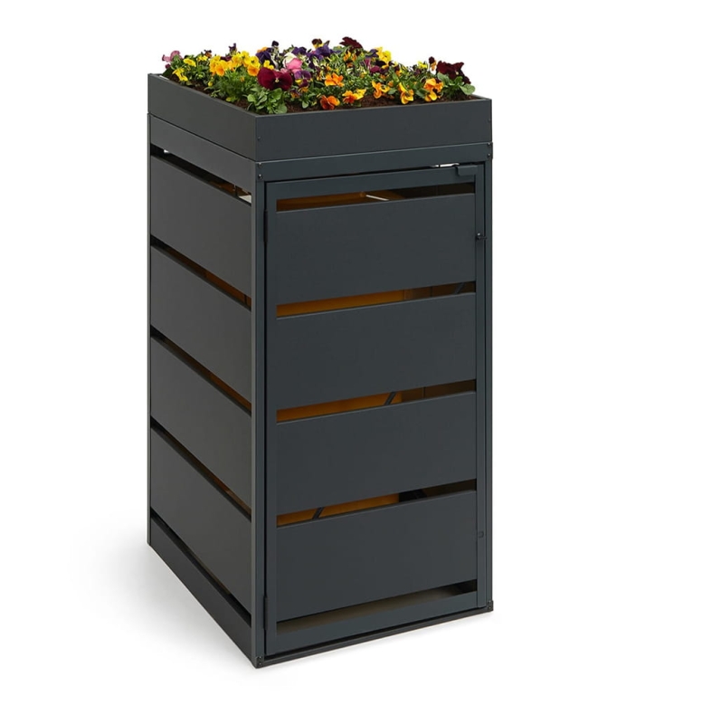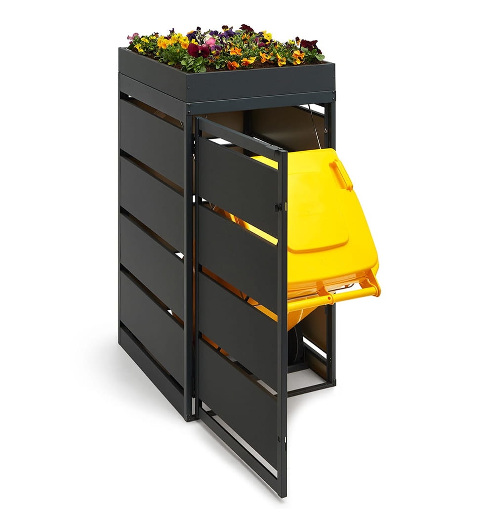 Estetyczna zabudowa kosza na śmieci z praktycznym kwietnikiem. Wykonana z wysokiej jakości blach ocynkowanych i malowanych proszkowo, odporna na warunki atmosferyczne, łatwa w montażu i użytkowaniu.