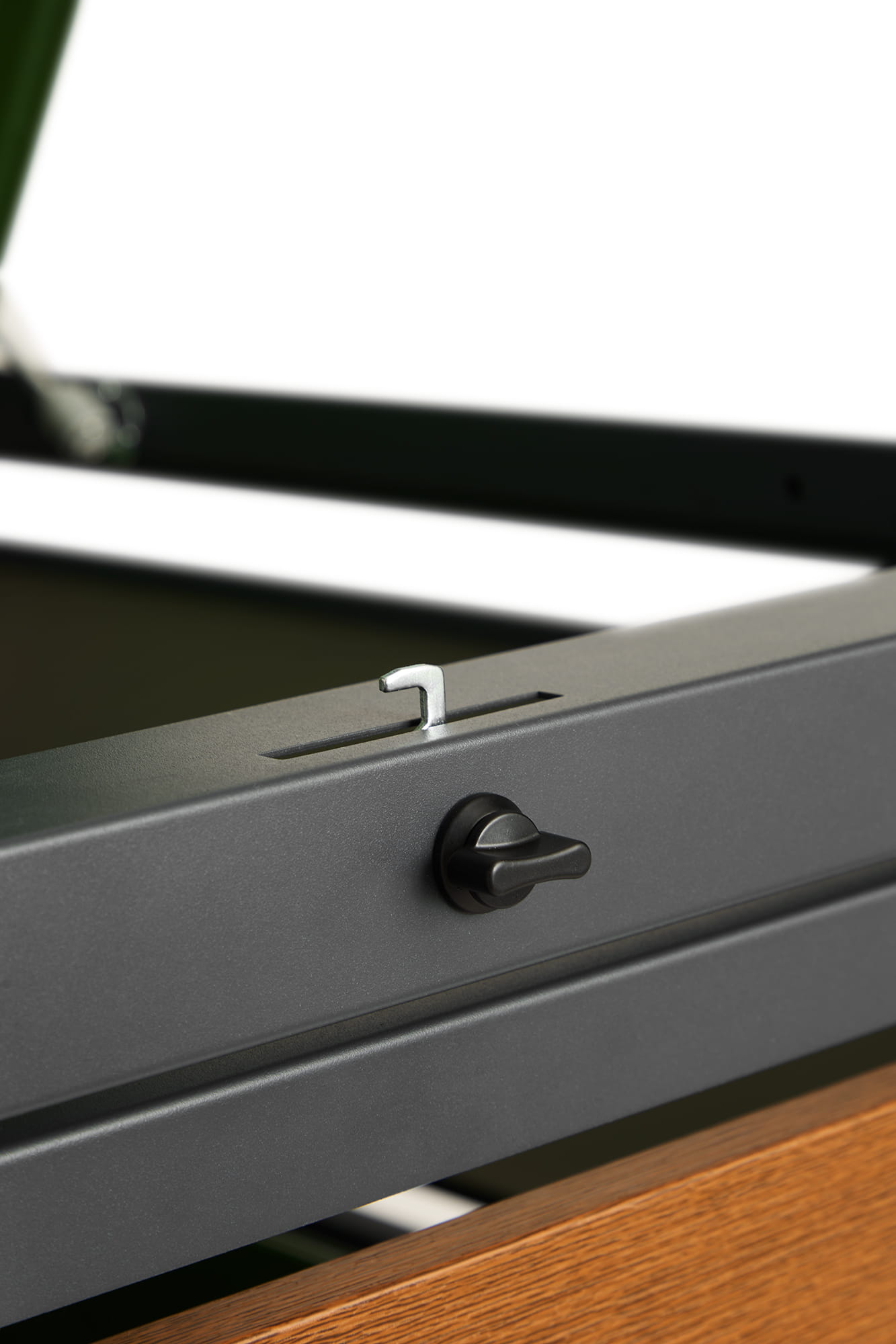 - ✔️ Drzwi frontowe do wjazdu/wyjazdu pojemnikiem oraz klapa podnoszona do góry z blokadą wysokości; siłowniki wspomagają otwieranie.