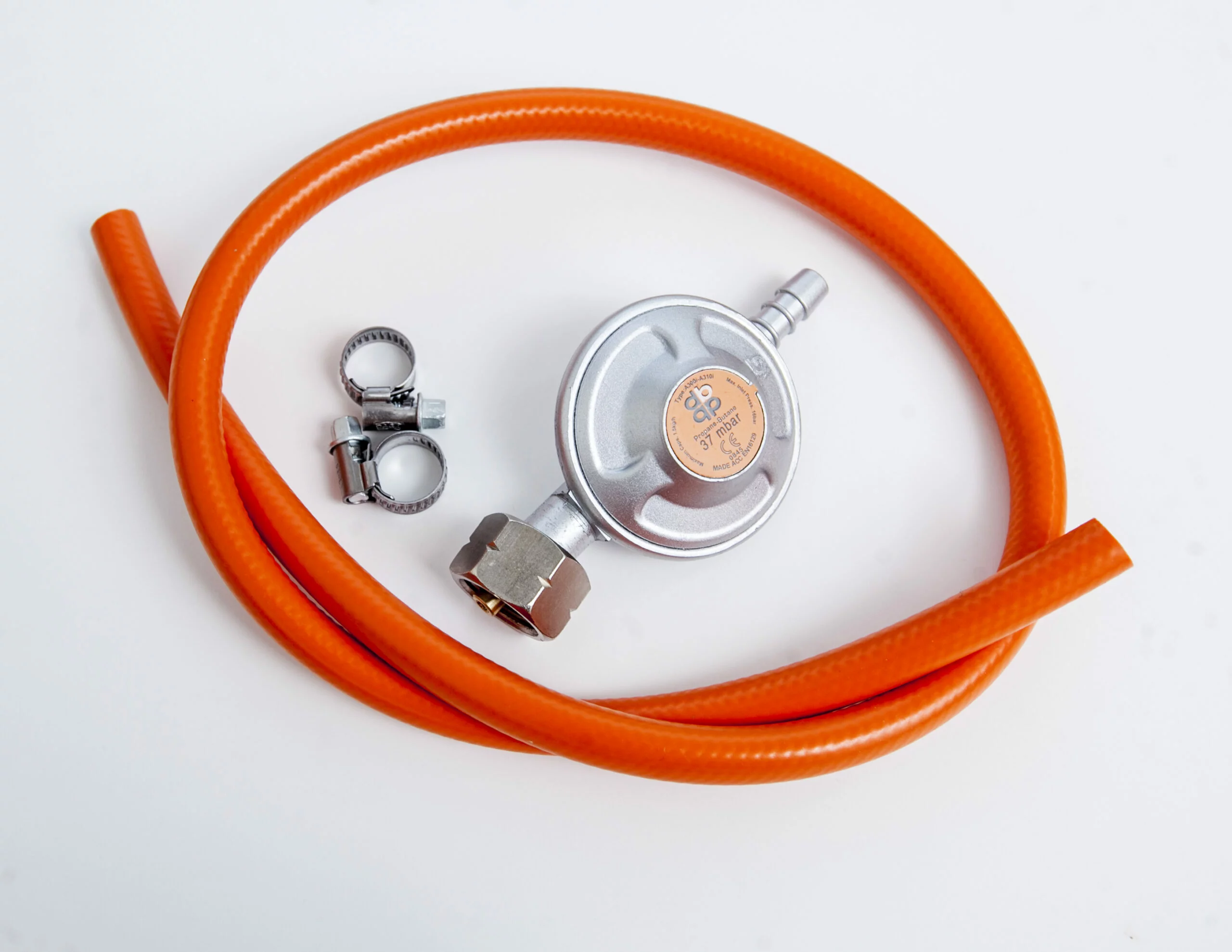 Aby prawidłowo zmontować ogrzewacz tarasowy Vulkan, potrzebujesz zestawu podłączeniowego. W skład zestawu wchodzą: reduktor, elastyczny przewód o długości około 1,2 m oraz dwie opaski uciskowe. Reduktor może być stosowany do butli o nominalnej zawartości gazu do 11 kg.